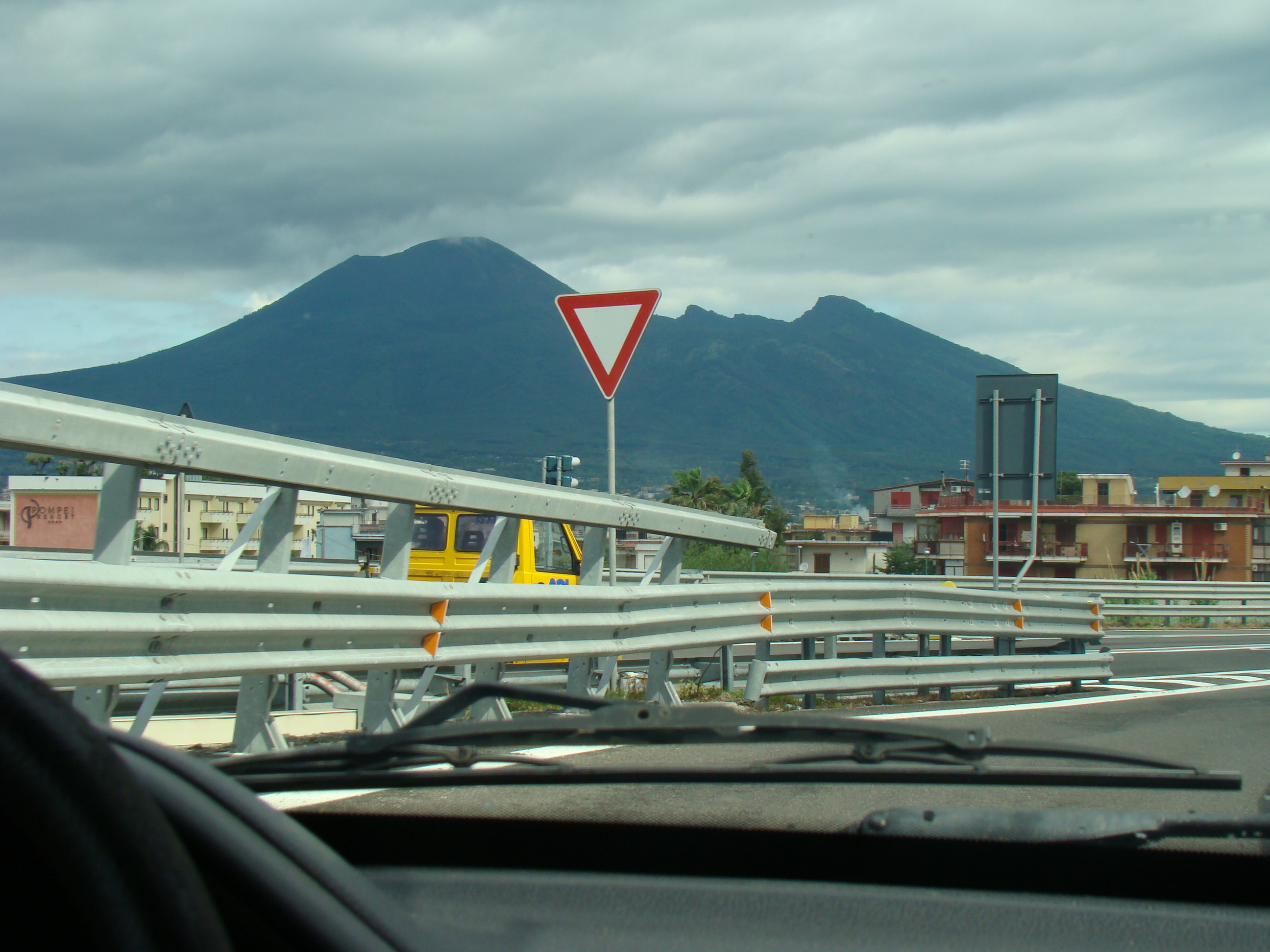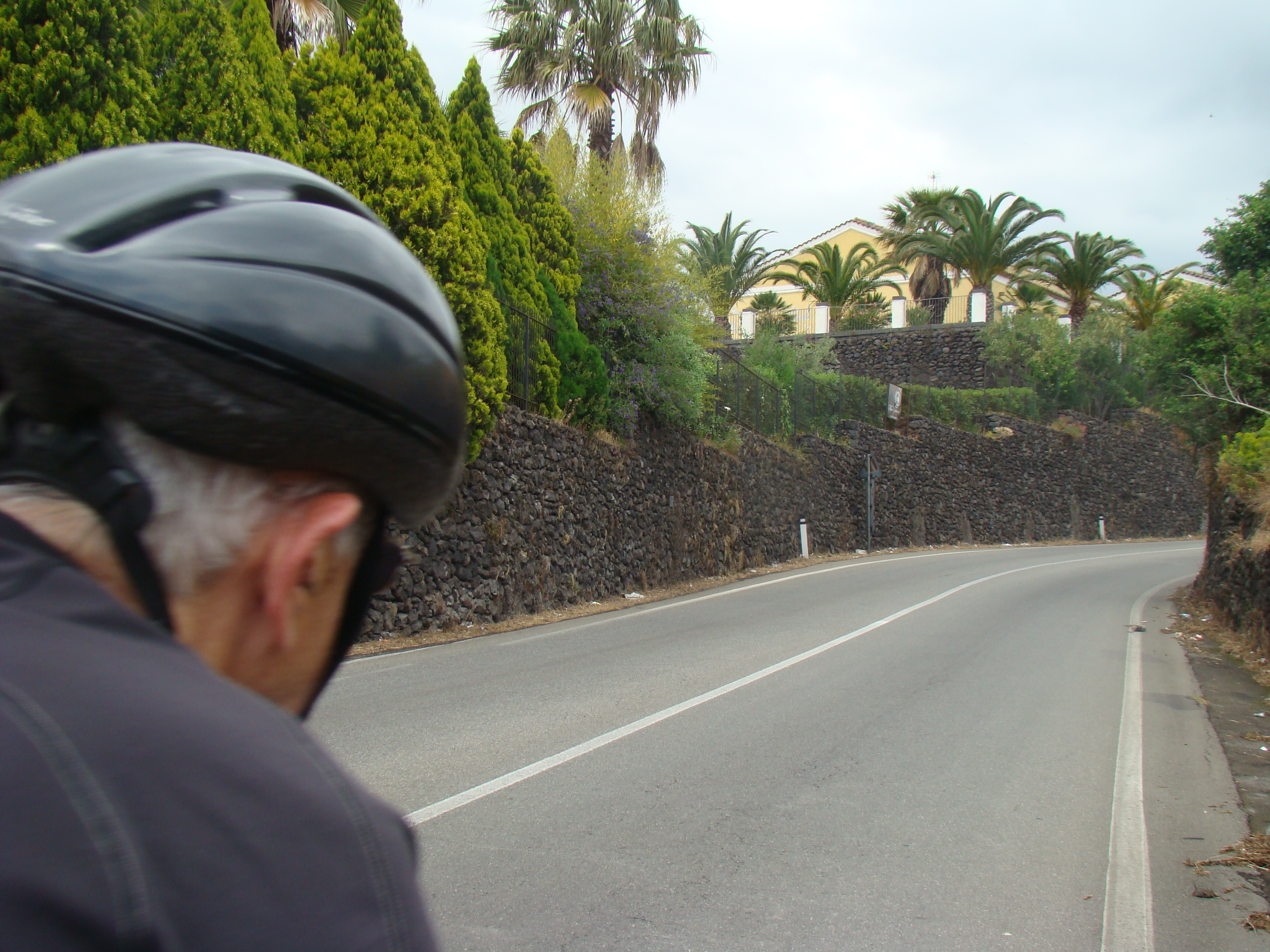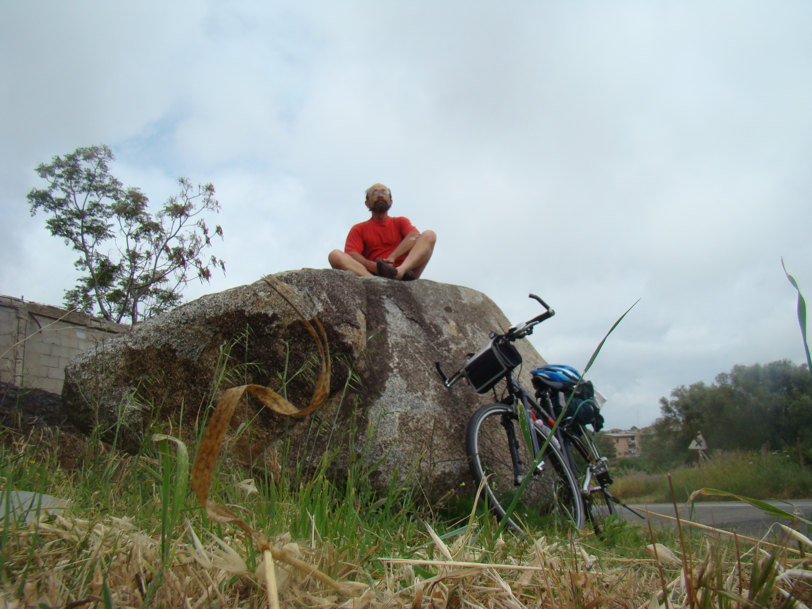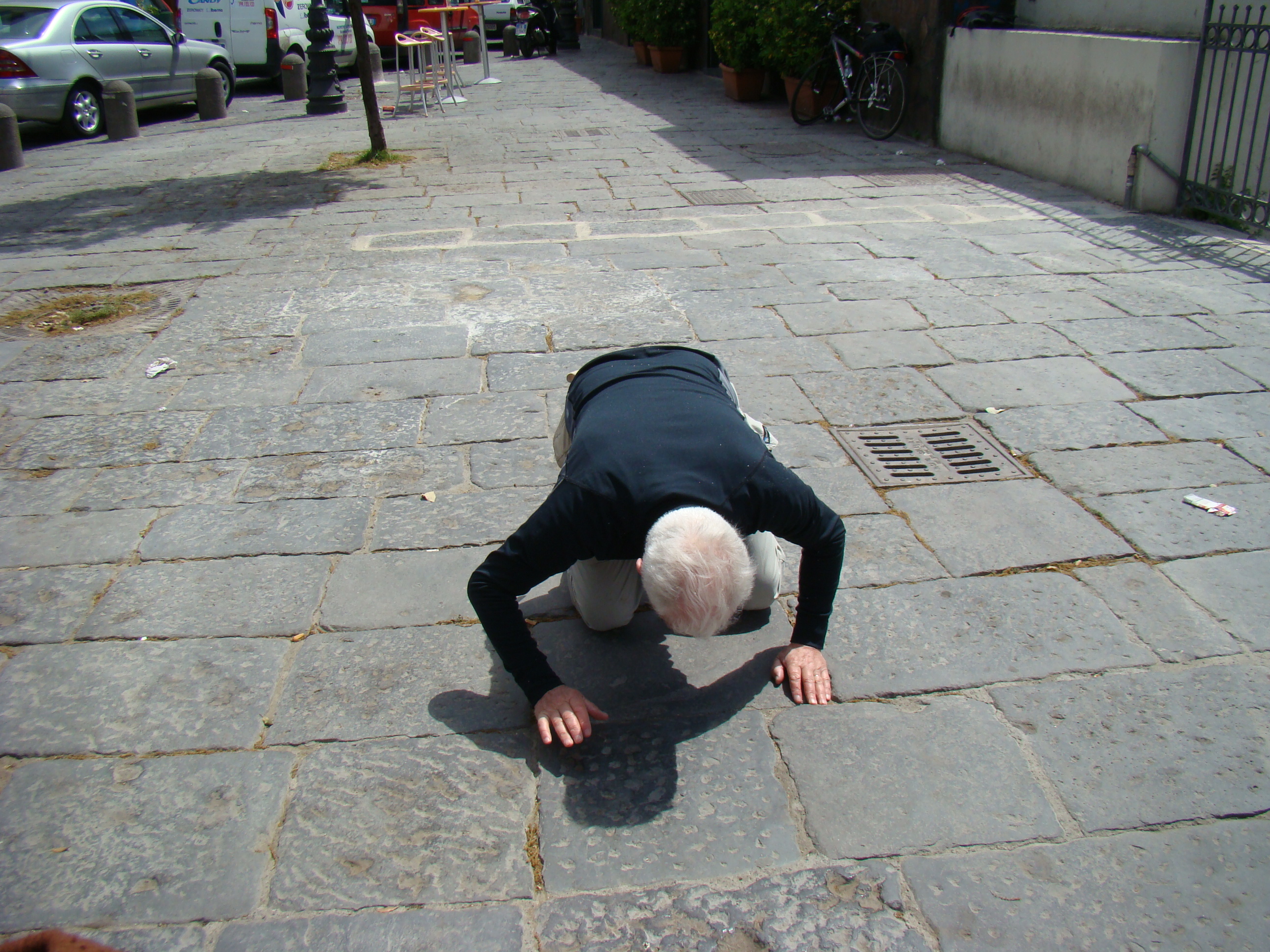 Au lundi 14 mai, jour de départ du haut des 1000 mètres du Vésuve, mon journal de voyage note : « Sentiment de venir saluer la genèse du monde de la vie terrestre. Sentiment partagé par mes 3 co-équipiers, impressionnés par la grandeur des lieux et le regard d’en haut qu’ils permettent sur la baie de Naples ».Il s’en est fallu cependant de peu que ce départ ne puisse nous hausser à ce point de vue cosmique, seulement d’une heureuse combinaison in extremis des éléments! Pluie tout le début de la matinée et recherche laborieuse de la voie d’accès terrestre avec deux autos nous véhiculant avec nos vélos. Vers 11 heures, le ciel s’est dégagé, libérant le soleil. Ce feu solaire (Hill et Carlowicz, 2006), plus souvent visible lui que le feu terrestre, a éclairé et rendu accessible le foyer de son fragment enterré Ainsi grâce à cette heureuse combinaison météorologique, a pu s’amorcer la première étape de notre route initiatique : rupture de la situation antérieure par découverte d’en haut d’un haut lieu volcanique, avec entrée sur la route transitionnelle par une descente assez vertigineuse, pavée de voitures, de bus, de camions et de larges plaques de basaltes en milieux urbains. De joie maligne, mes compagnons humains m’ont obligé à embrasser les pavés de basalte, durs représentants du refroidissement des laves magmatiques sur la terre mère, au contact de l’eau ou de l’air.
