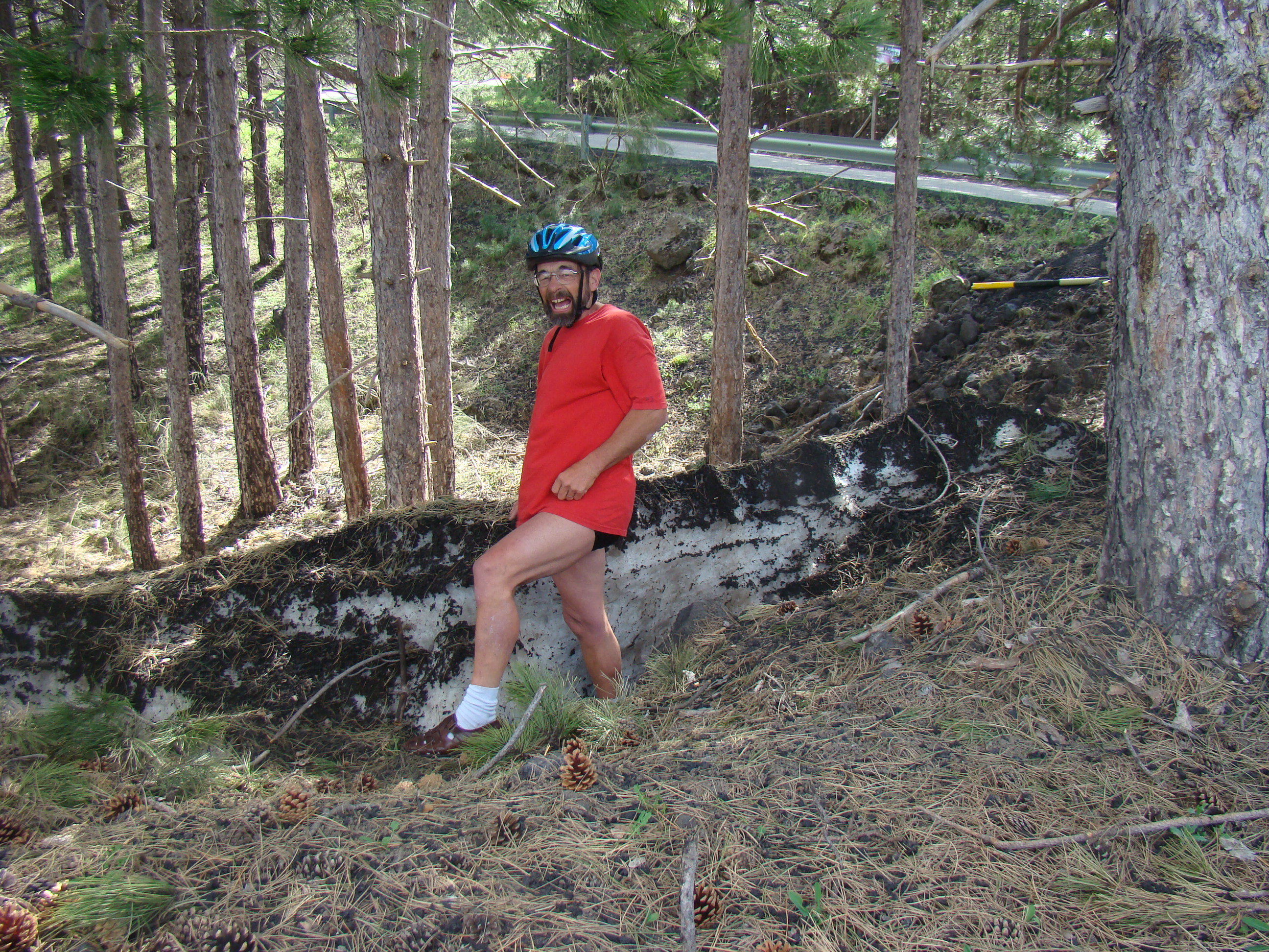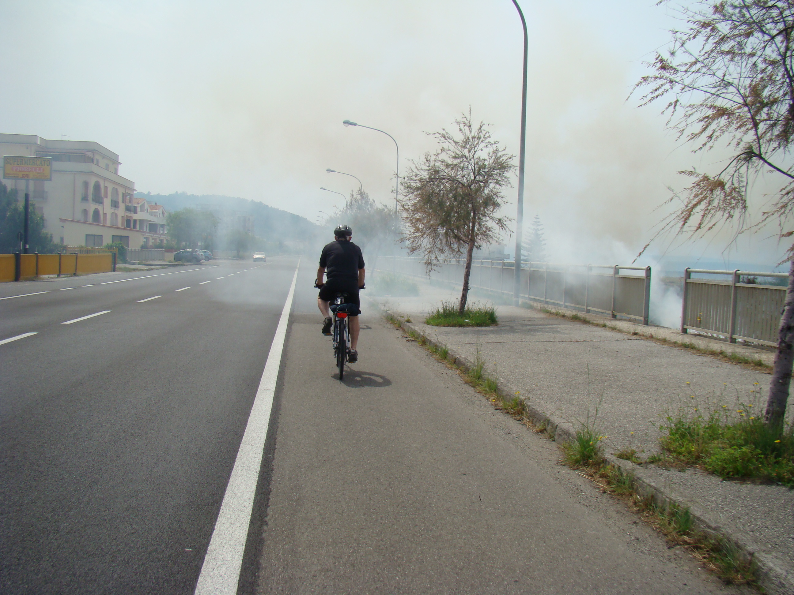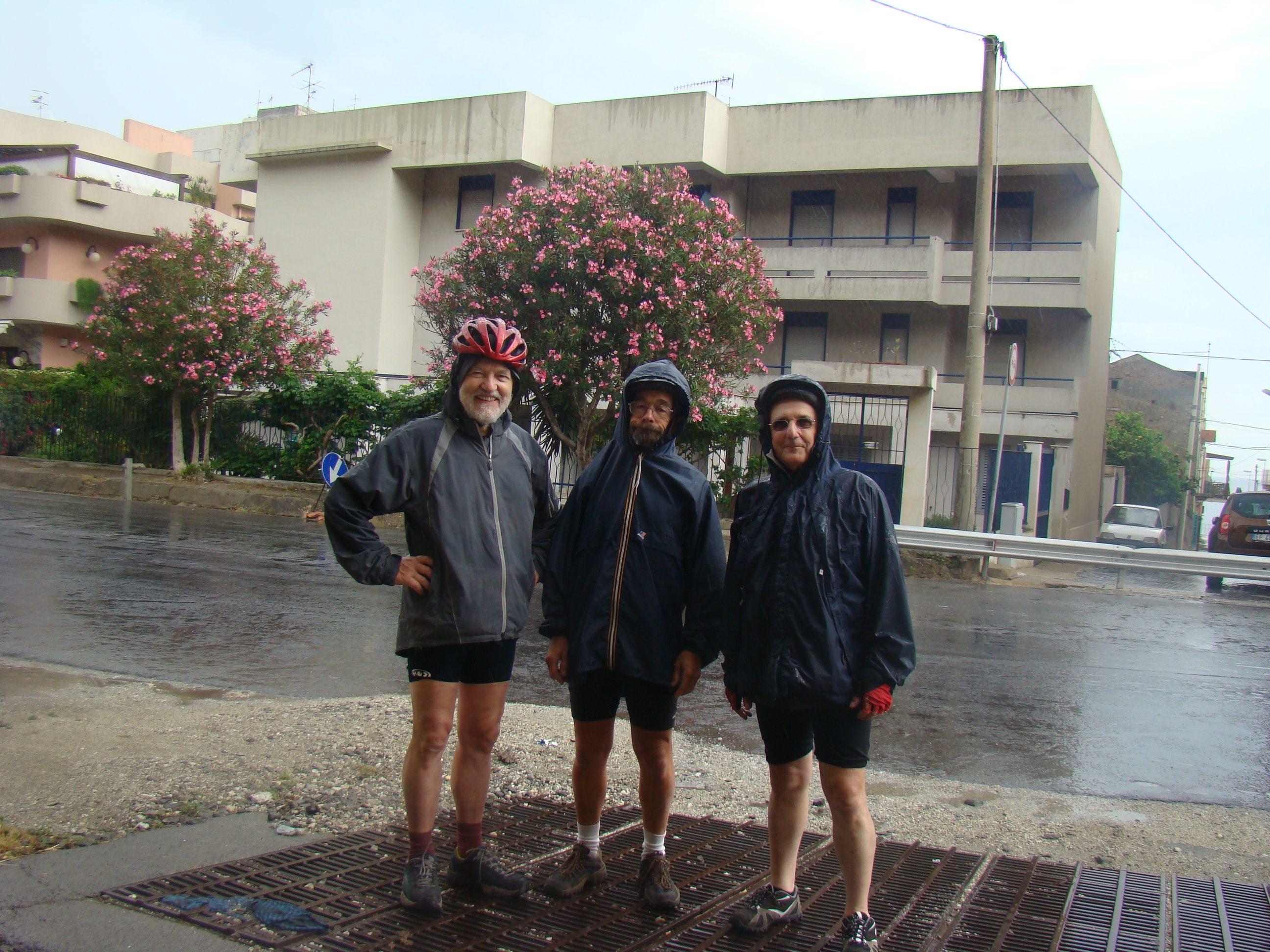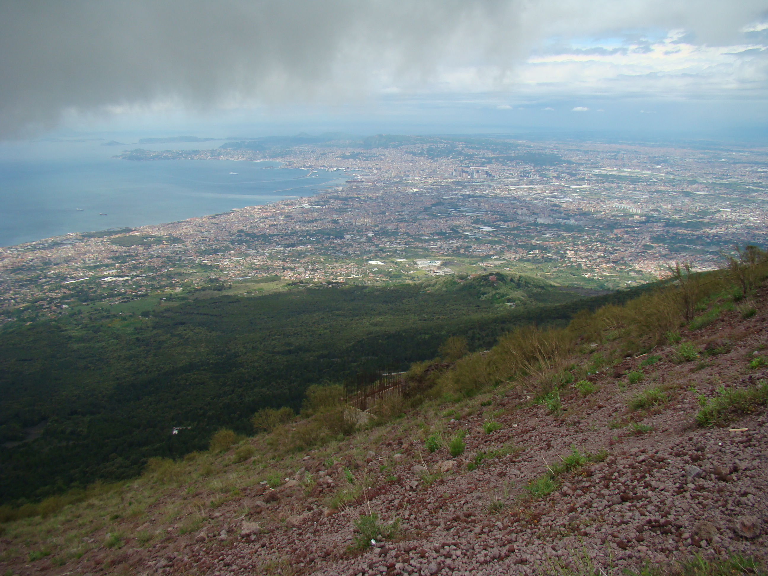 Au lundi 14 mai, jour de départ du haut des 1000 mètres du Vésuve, mon journal de voyage note : « Sentiment de venir saluer la genèse du monde de la vie terrestre. Sentiment partagé par mes 3 co-équipiers, impressionnés par la grandeur des lieux et le regard d’en haut qu’ils permettent sur la baie de Naples ».Il s’en est fallu cependant de peu que ce départ ne puisse nous hausser à ce point de vue cosmique, seulement d’une heureuse combinaison in extremis des éléments! Pluie tout le début de la matinée et recherche laborieuse de la voie d’accès terrestre avec deux autos nous véhiculant avec nos vélos. Vers 11 heures, le ciel s’est dégagé, libérant le soleil. Ce feu solaire (Hill et Carlowicz, 2006), plus souvent visible lui que le feu terrestre, a éclairé et rendu accessible le foyer de son fragment enterré Ainsi grâce à cette heureuse combinaison météorologique, a pu s’amorcer la première étape de notre route initiatique : rupture de la situation antérieure par découverte d’en haut d’un haut lieu volcanique, avec entrée sur la route transitionnelle par une descente assez vertigineuse, pavée de voitures, de bus, de camions et de larges plaques de basaltes en milieux urbains. De joie maligne, mes compagnons humains m’ont obligé à embrasser les pavés de basalte, durs représentants du refroidissement des laves magmatiques sur la terre mère, au contact de l’eau ou de l’air.