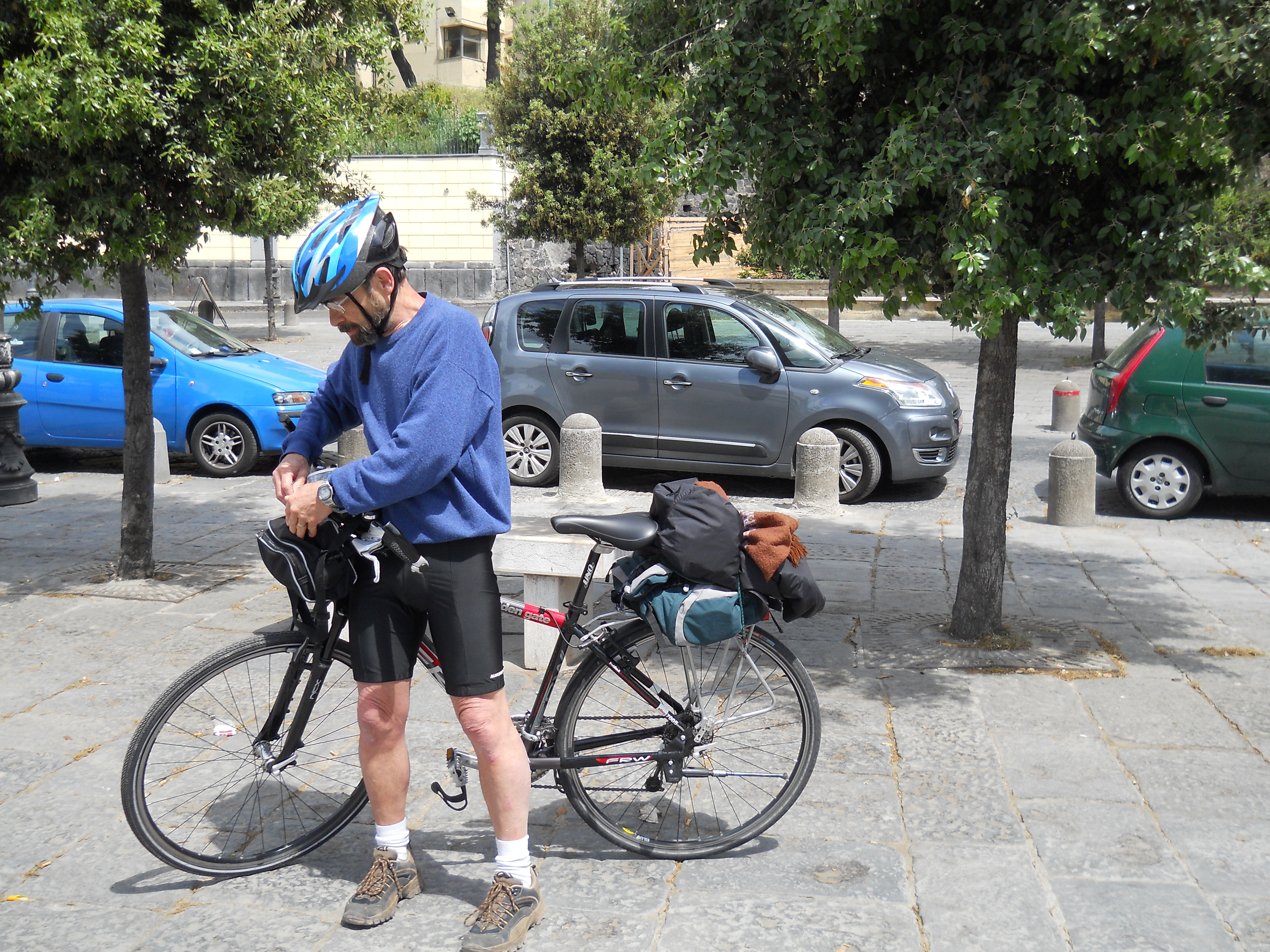 Mon ami Gaston Pineau caresse depuis longtemps le projet d’une excursion à bicyclette en Italie, de Naples à Taormina, en Sicile. Plus précisément, il souhaite parcourir la route qui sépare deux célèbres volcans : le Vésuve et l’Etna. La route du feu! L’objectif n’est pas seulement de réussir à pédaler sept cents kilomètres en onze jours, mais surtout de mener une réflexion sur cet élément de la vie qu’est le feu. Il s’est déjà livré à un exercice similaire avec les trois autres éléments : l’air, l’eau, la terre et il en a fait trois livres. En mai 2012, Gaston réalise son projet, accompagné de trois collègues et amis, motivés à vivre cette aventure avec lui. Il s’agit de Bernard, médecin, de Gérard, entrepreneur spécialisé en restauration de bâtiments historiques et de moi-même.
