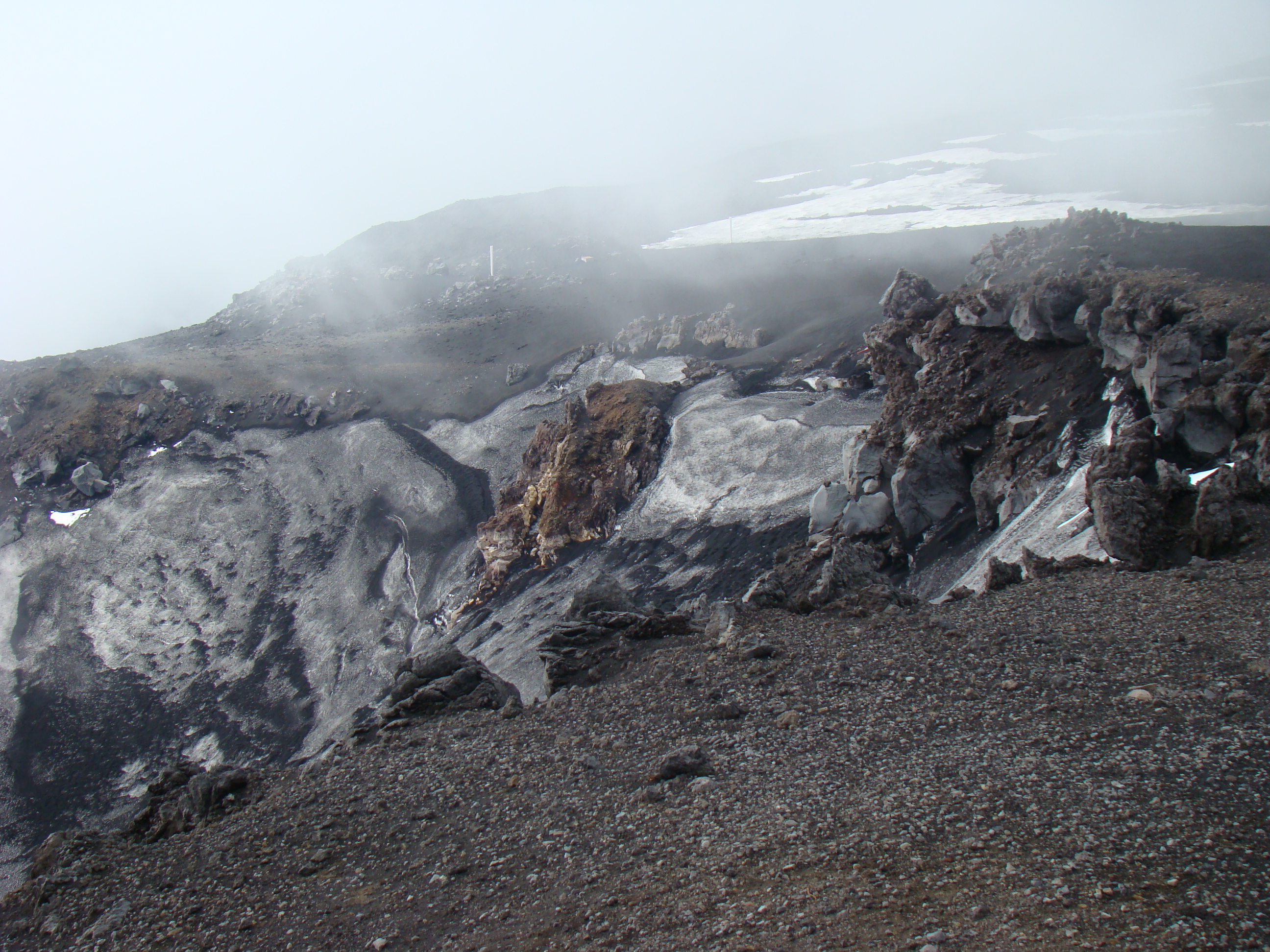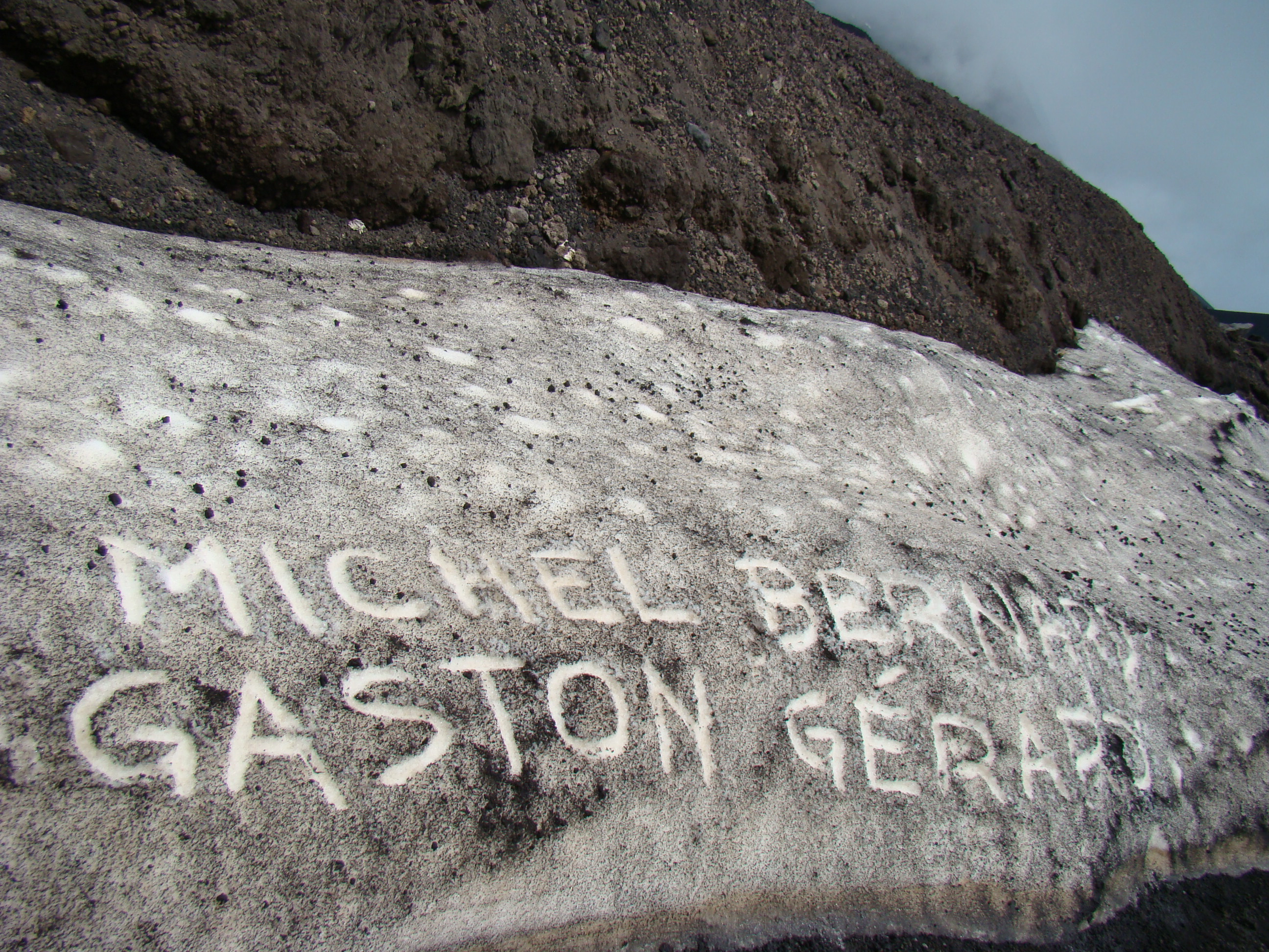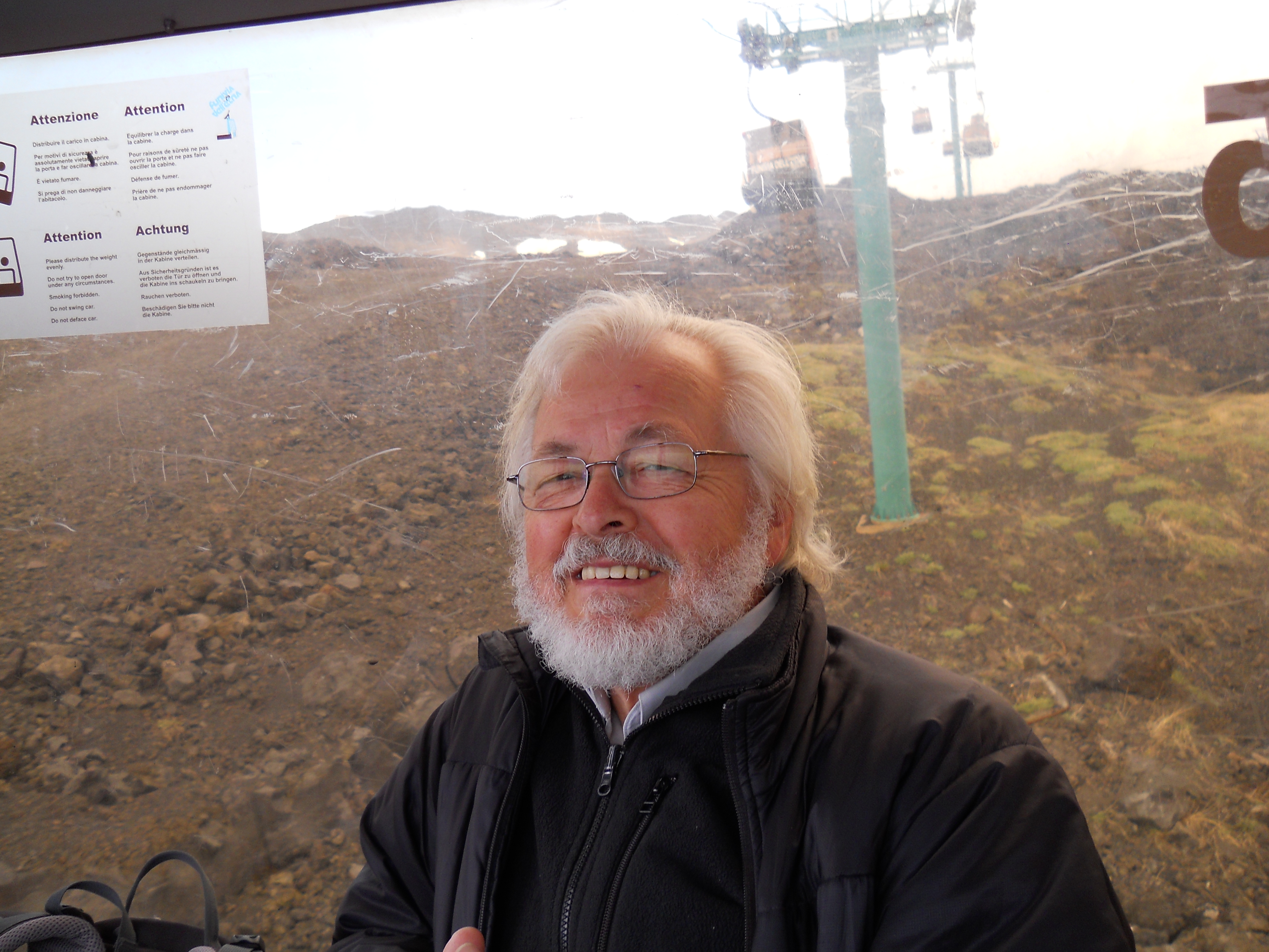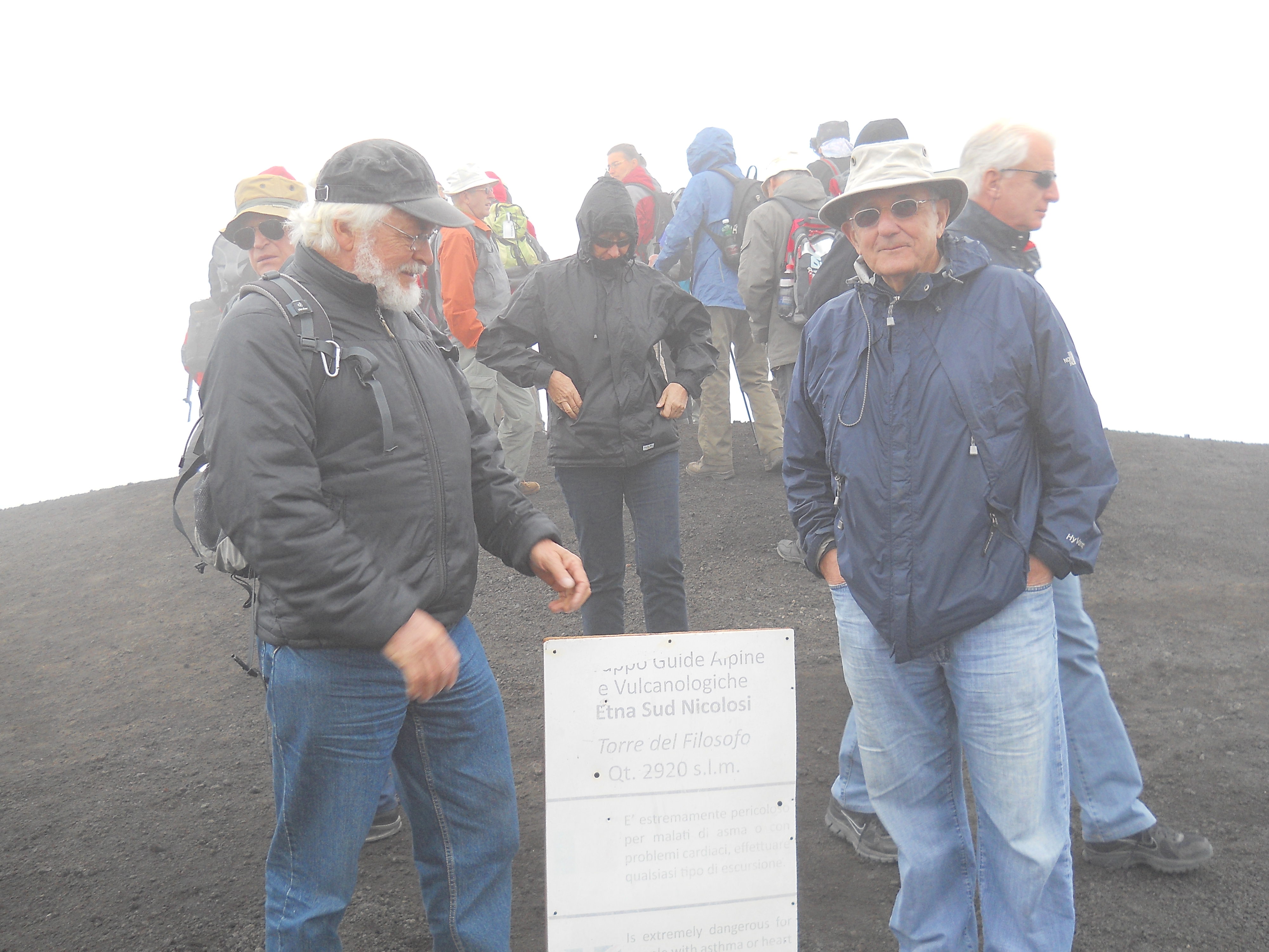 Le samedi 26 mai, jour de l’ascension ultime de L’Etna, ressort de mon journal, la phrase suivante, tiré du dernier chapitre de Fragments d’une poétique du feu, , Empédocle, : « L’Etna d’Empédocle est vraiment un sommet de l’homme et le sommet d’un monde »(1988,p.138). Après la journée précédente de reconnaissance, l’ascension des 2000 derniers mètres suivant la fin de la route d’accès, s’est faite selon les forces et désir de chacun : à pied, en téléphérique et tout-terrain. Météorologie variable avec éclaircie, brouillard, et même un peu de neige contrastant avec la chaleur du sol, près de certains cratères. Presque au sommet, un petit écriteau émerge à peine des laves desséchées. Il signale la Tour du philosophe, ensevelie lors d’une éruption en 2002. Belle fin après le saut de celui-ci dans le cratère. Qu’en comprendre? S’aider d’un premier de cordée, comme Bachelard, pour tenter de s’approcher de ces sommets est un réflexe méthodologique élémentaire.