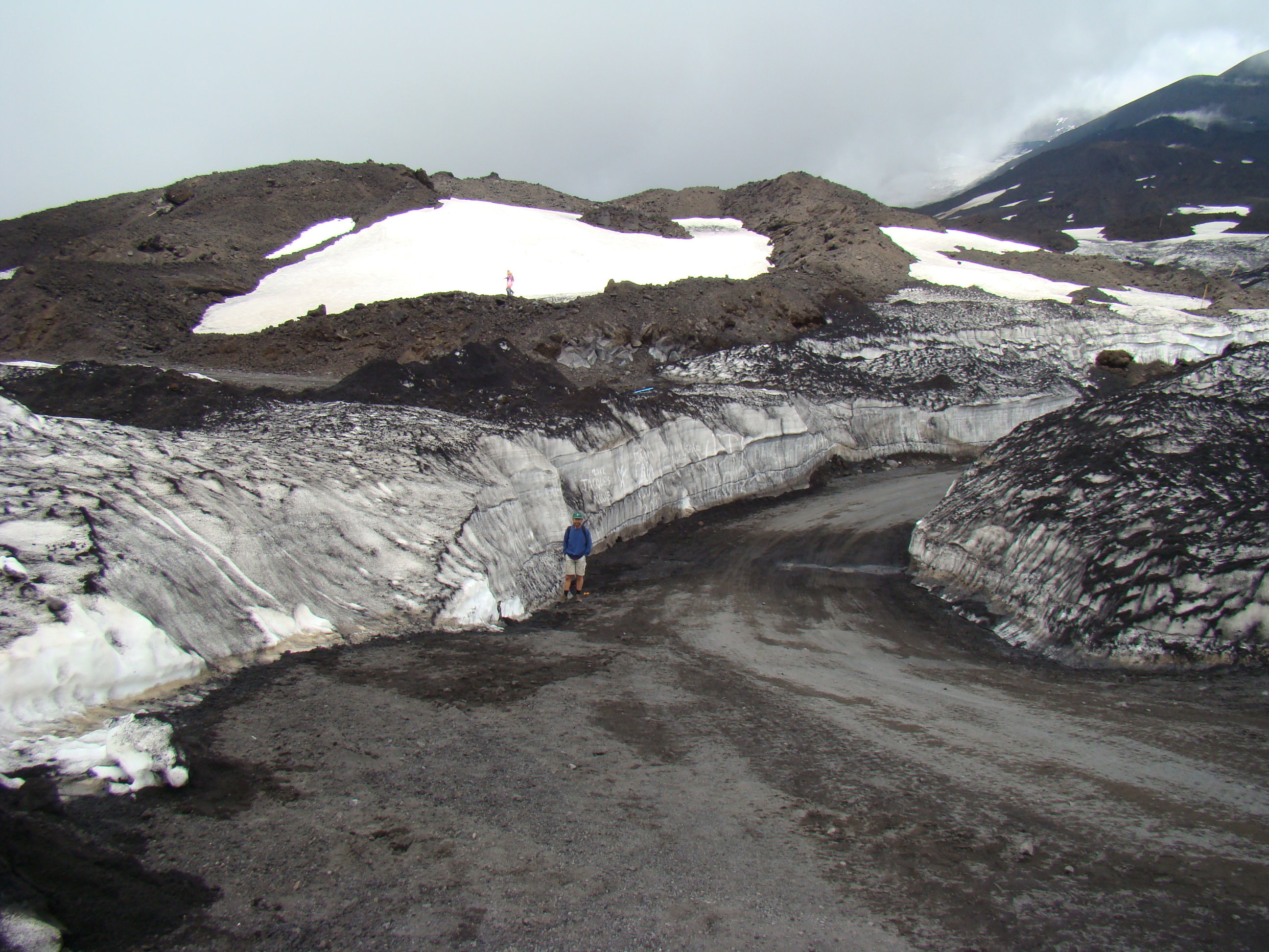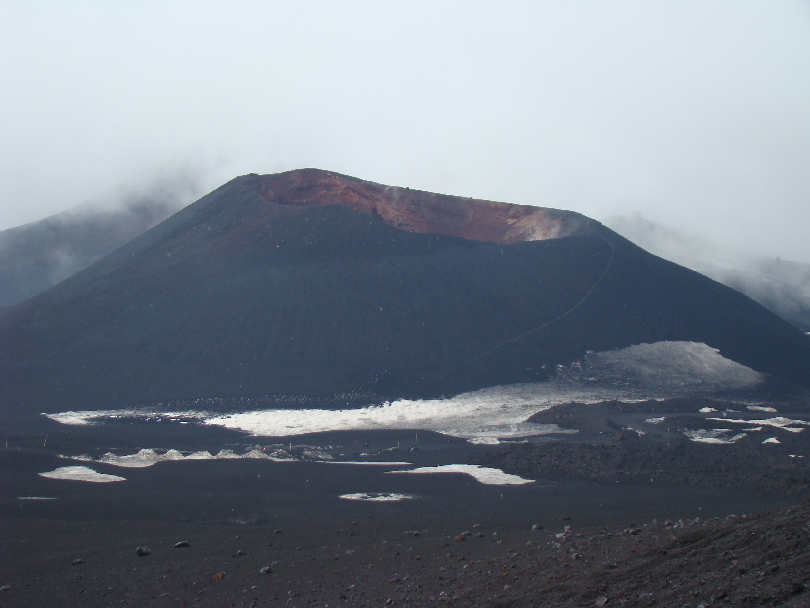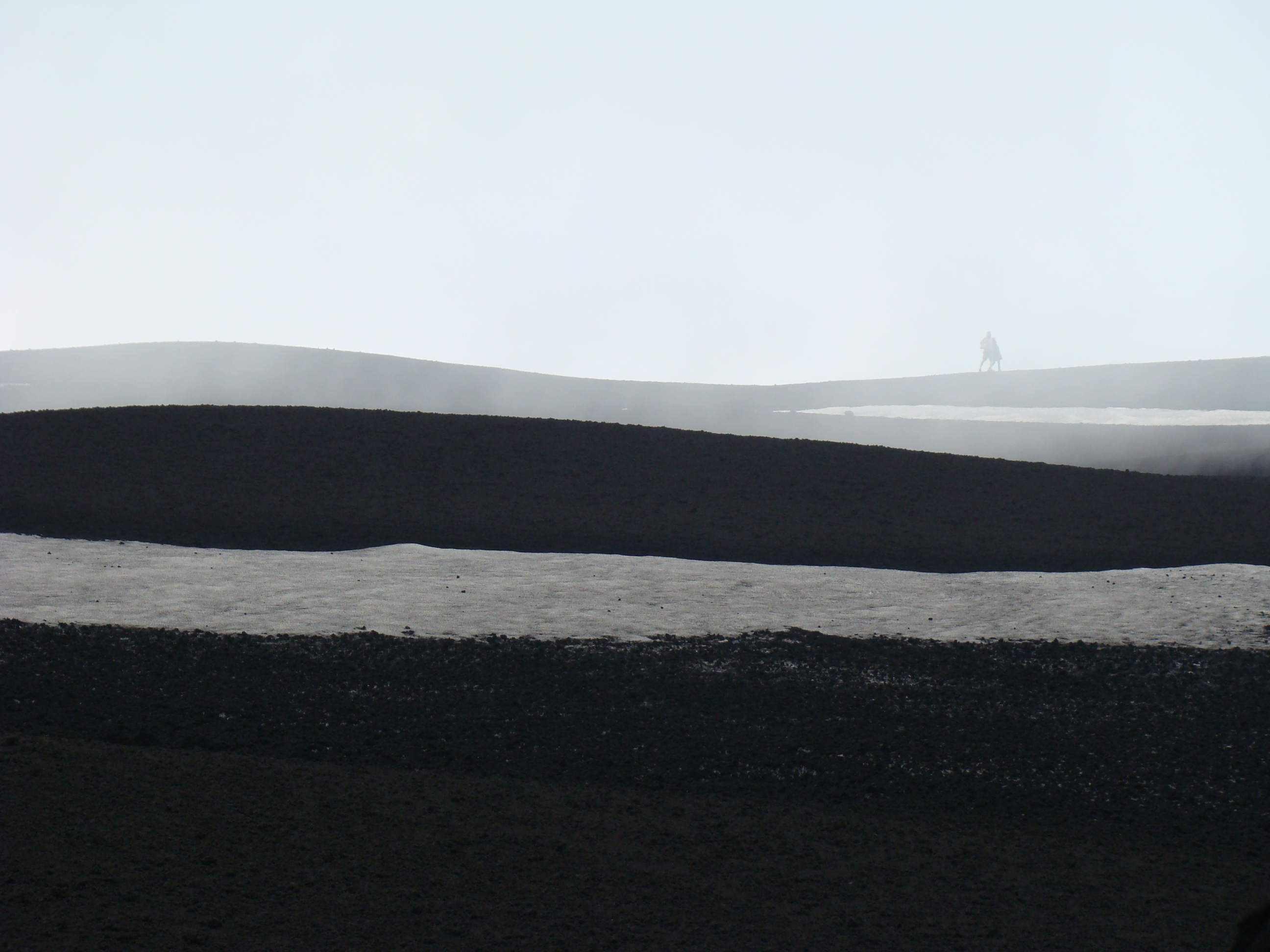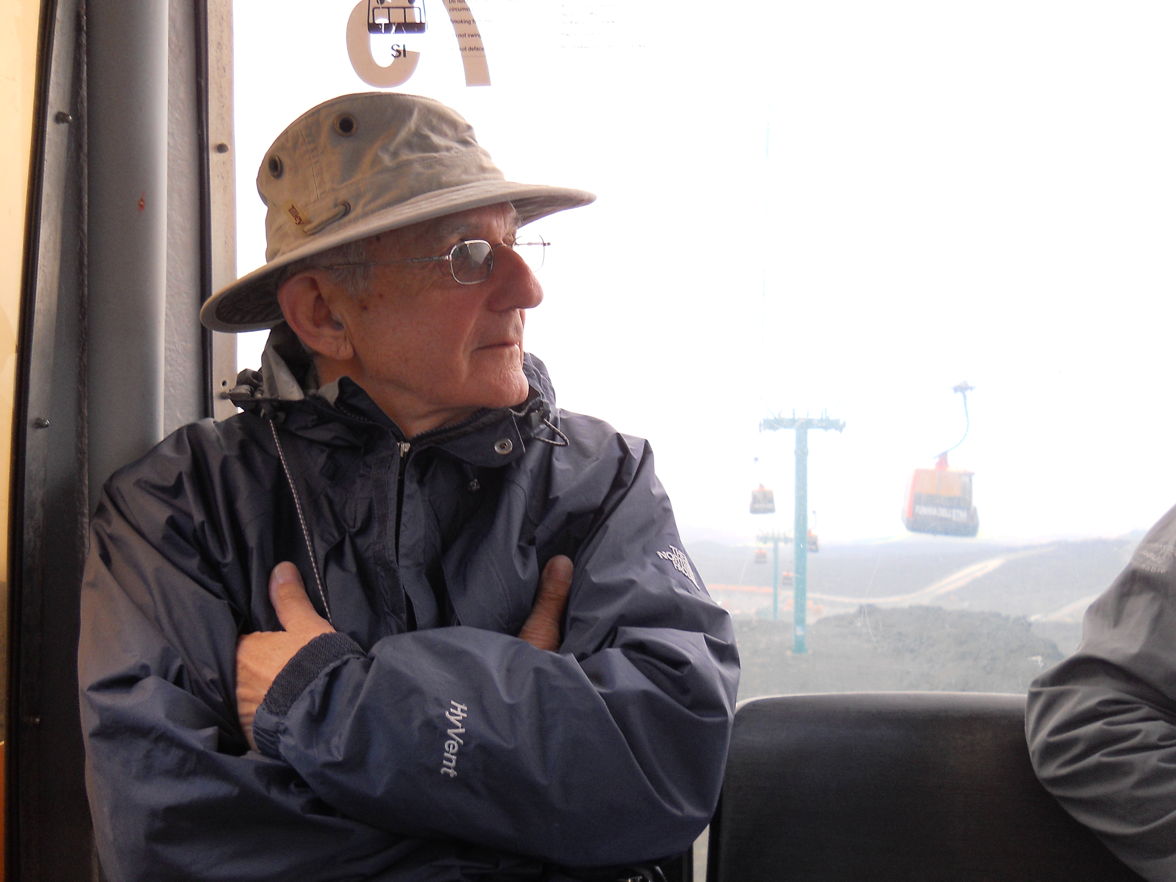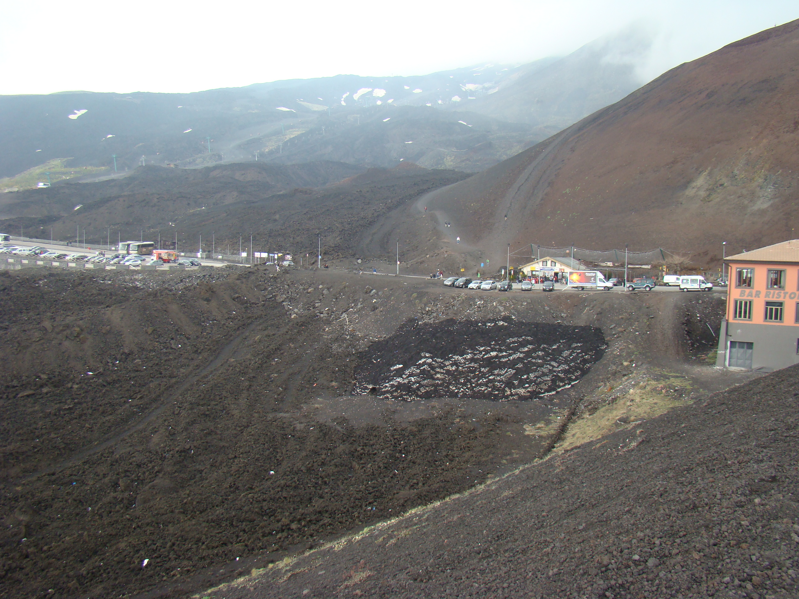 Le samedi 26 mai, jour de l’ascension ultime de L’Etna, ressort de mon journal, la phrase suivante, tiré du dernier chapitre de Fragments d’une poétique du feu, , Empédocle, : « L’Etna d’Empédocle est vraiment un sommet de l’homme et le sommet d’un monde »(1988,p.138). Après la journée précédente de reconnaissance, l’ascension des 2000 derniers mètres suivant la fin de la route d’accès, s’est faite selon les forces et désir de chacun : à pied, en téléphérique et tout-terrain. Météorologie variable avec éclaircie, brouillard, et même un peu de neige contrastant avec la chaleur du sol, près de certains cratères. Presque au sommet, un petit écriteau émerge à peine des laves desséchées. Il signale la Tour du philosophe, ensevelie lors d’une éruption en 2002. Belle fin après le saut de celui-ci dans le cratère. Qu’en comprendre? S’aider d’un premier de cordée, comme Bachelard, pour tenter de s’approcher de ces sommets est un réflexe méthodologique élémentaire.