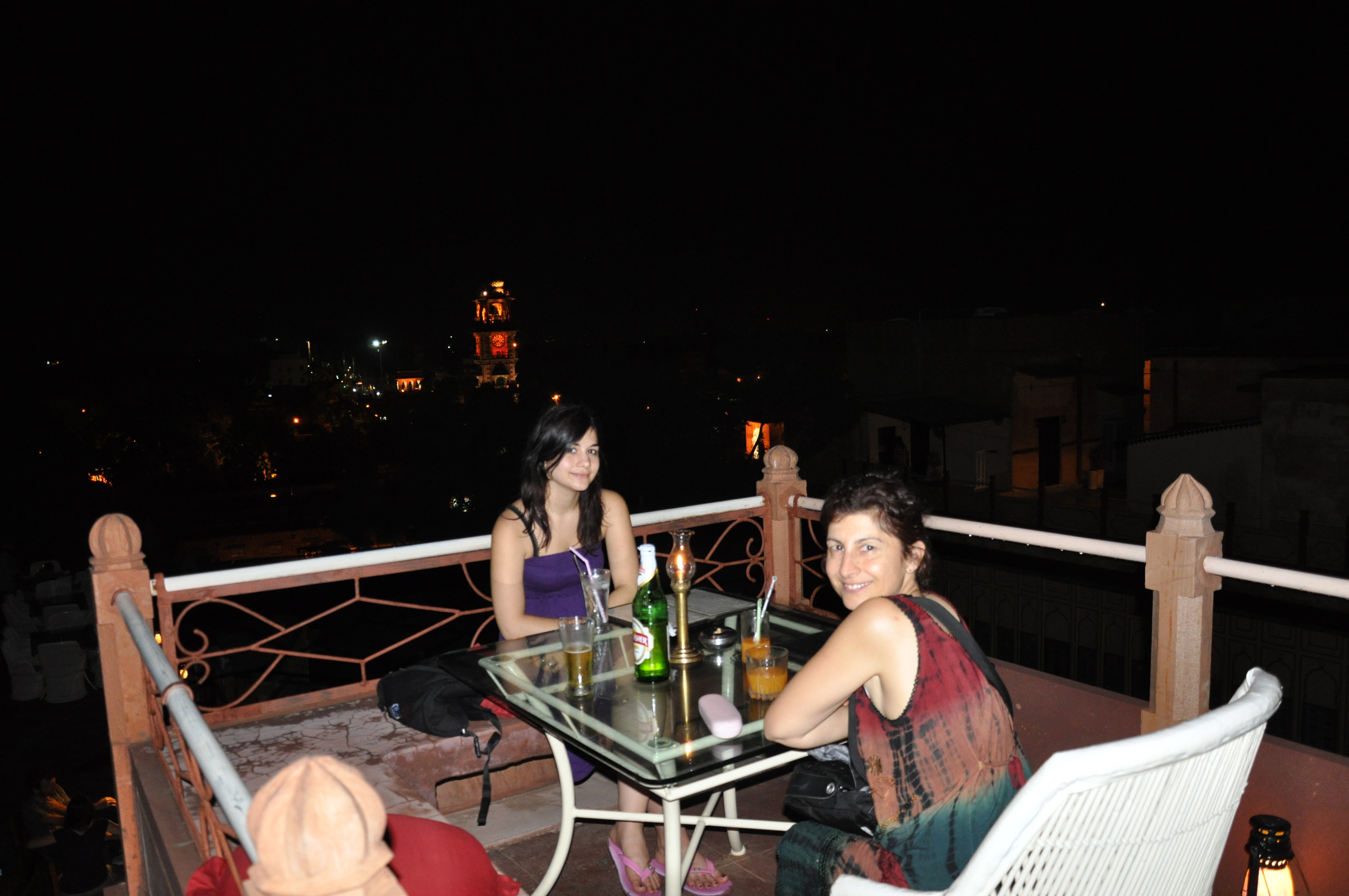 Nous rencontrons un homme qui nous montre sa collection de billets de banque du monde entier. Il a un billet de 10 francs de l’époque de notre « jeunesse ». Il aimerait acheter une petite coupure en euros. Il tient un restaurant avec sa femme. Le soir en échange d’un billet de 10€ tant espéré nous prendrons notre repas du soir et une jeune fille de la famille fera un dessin au henné sur la main de Lola. Tout le monde est ravi. C’est un restaurant familial avec une terrasse sur les toits (ouf, il y a de l’air !) et une vue imprenable sur le fort éclairé et les toits terrasses alentours.