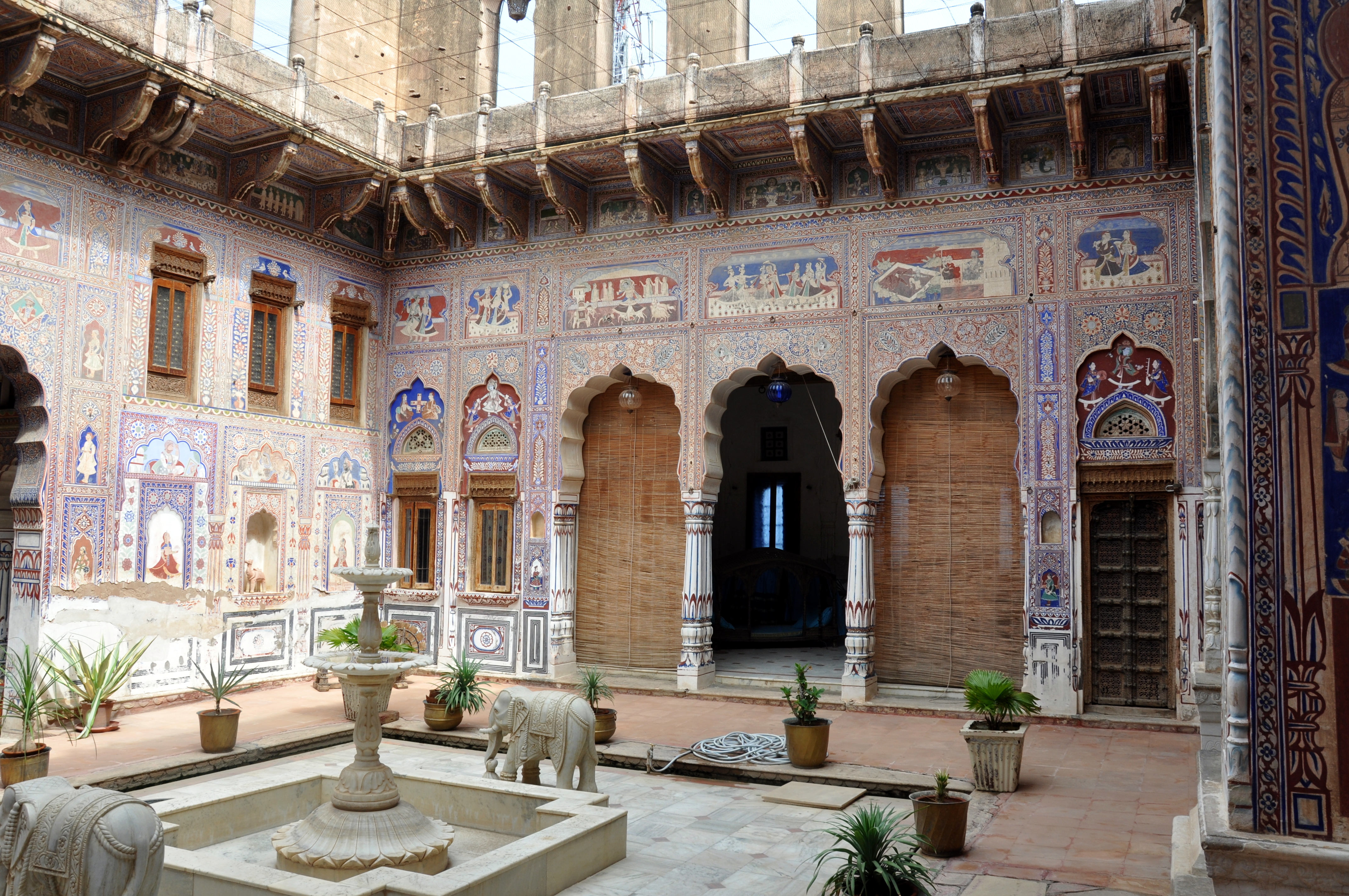 Nous quittons Mandawa. Jusqu’à la sortie de la ville nous voyons de très anciennes havelis malheureusement trop souvent en très mauvaise état. La restauration du patrimoine n’est vraiment pas la priorité. Quelques km plus loin nous traversons une zone où des pluies de mousson ont fait de gros dégâts et nous passons sur des routes où il y a de l’eau jusqu’à la moitié des roues. Nous arrivons dans la ville de Fatehpur qui est en partie inondée. Mais nous devions visiter ici une haveli très connue restaurée par une artiste française qui y vit et a créé un centre culturel et accueille des artistes. Notre chauffeur parvient à nous approcher au plus près mais ensuite le visite sera bien méritée car nous devons marcher sur des étroites allées de pierres qui émergent de l’eau. Il ne faut surtout pas tomber car l’eau est grise et chargée de détritus. Nous arrivons « sains et saufs » et notre témérité est récompensée. C’est un lieu magnifique et en plus c’est une étudiante française qui nous sert de guide et qui nous raconte la vie à l’époque où cette maison située sur la route de la soie accueillait les caravanes et où l’on y faisait le commerce. Elle raconte aussi la vie du maitre des lieux, de ses femmes et concubines à la mode Hindou.