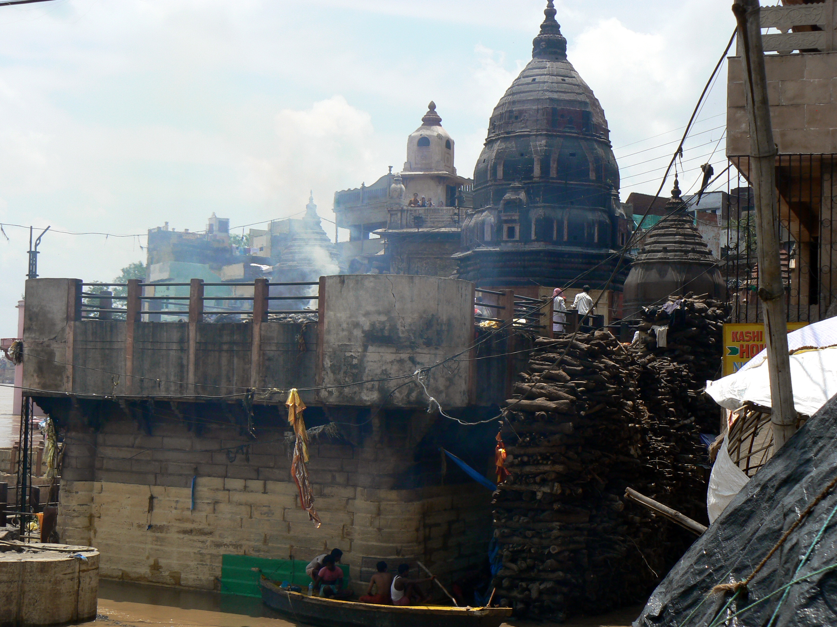 Hier nous avons vu des processions emmenant des corps vers un ghât de crémation qui était juste à côté de notre hôtel. Nous sommes surpris par les montagnes de bois disposées autour d'une plate- forme où les corps brûlent. C'est une sensation étrange de voir les flammes et les fumées et de savoir qu'ensuite tout sera déversé dans le fleuve.